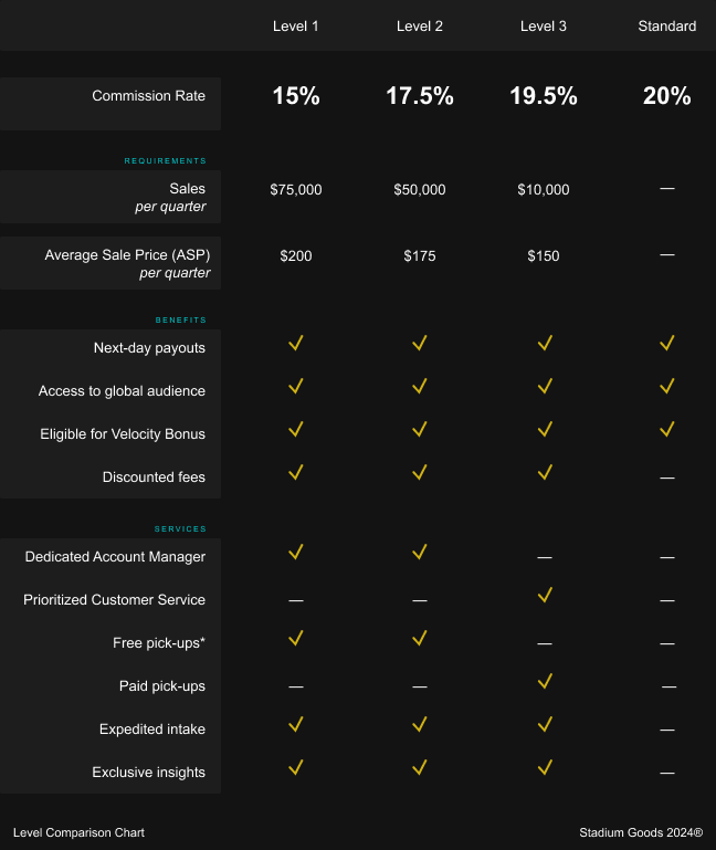 - The StadiumSupply Pro Seller program allows consignors to elevate their experience with Stadium Goods as they sell more volume - each higher level gives consignors more robust benefits, including a lower base selling commission rate. All consignors with Stadium Goods will continue to enjoy access to a global customer base, premium pricing, end-to-end inventory management, and fast next-day payouts. Check out our detailed blog post here for more info!